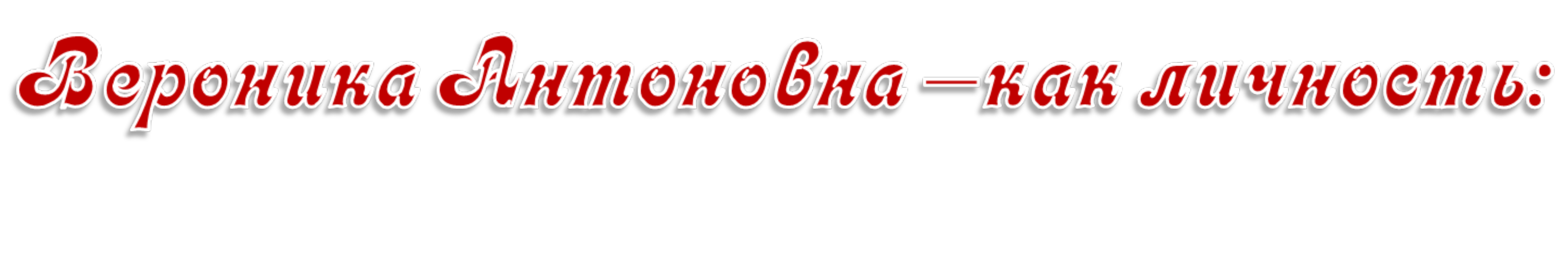 Вероника Антоновна в период своей работы в дошкольном учреждении зарекомендовала себя как методически грамотный, профессионально творческий педагог, добросовестно и ответственно относящийся к своей работе. Педагогическая грамотность обеспечивает педагогу высокий уровень профессиональной компетентности, способствует реализации современных требований к организации образовательного процесса, направленного на развитие личности ребенка, его самостоятельности и инициативности.