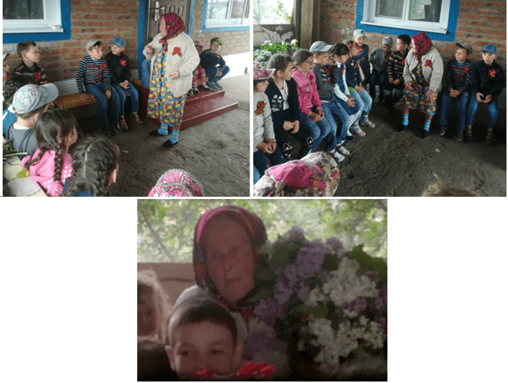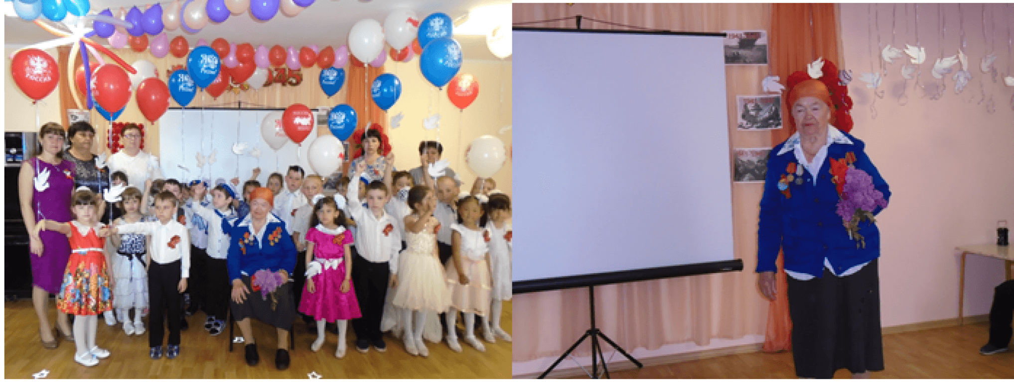 На праздник была приглашена Пущева Анна Пантелеевна, которая видела войну глазами ребенка. Анна Пантелеевна рассказала детям о своем детстве, о том, как началась война. Дети пели песни, исполняли задорные казачьи танцы, веселую «Кадриль», читали стихи. Словами благодарности за мужество, отвагу и терпение дети и взрослые поздравили Анну Пантелеевну с Днем Победы.