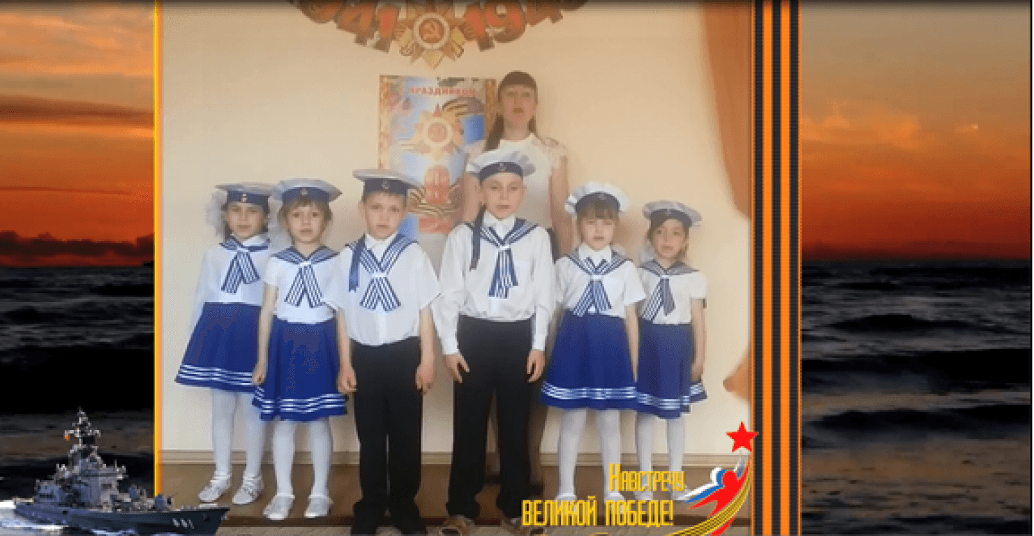 Детский сад принял участие в патриотической районной акции «Песни Победы», дети, одетые в матросскую форму, вместе с музыкальным руководителем исполнили песню военных лет «Споемте друзья»