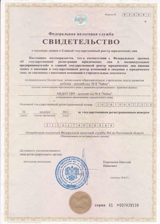 Настоящее свидетельство подтверждает, что российская организация муниципальное бюджетное дошкольное образовательное учреждение центр развития ребенка - детский сад №8 «Чайка»