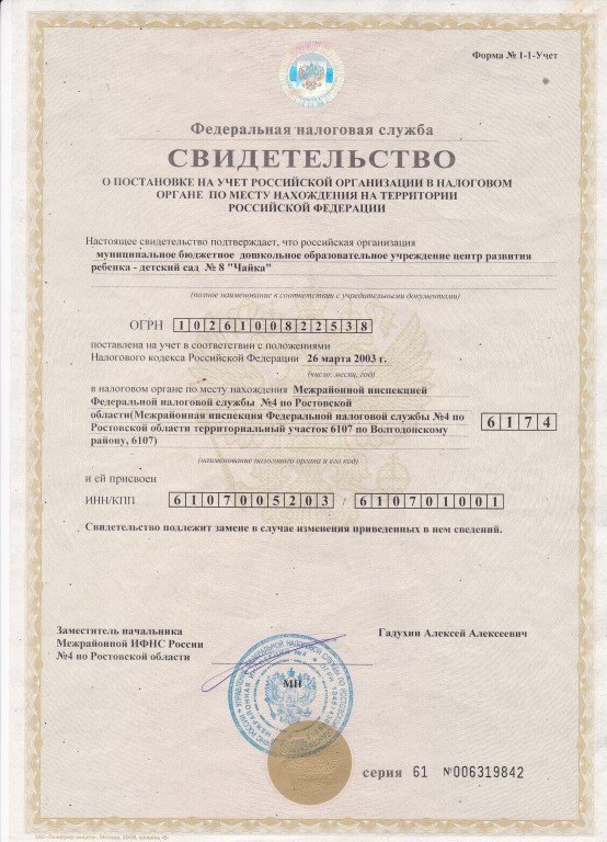 Свидетельство о постановке на учет в налоговом органе