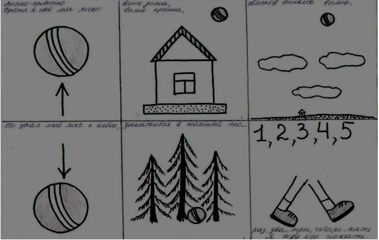 На каждое слово или словосочетание придумывается картинка и весь текст зарисовывается схематично. Любую сказку, пословицу, поговорку, рассказ, стихотворение можно «записать», используя картинки и символы. Эти схемы служат зрительным планом, помогающим ребенку воссоздать услышанное и запомнить.