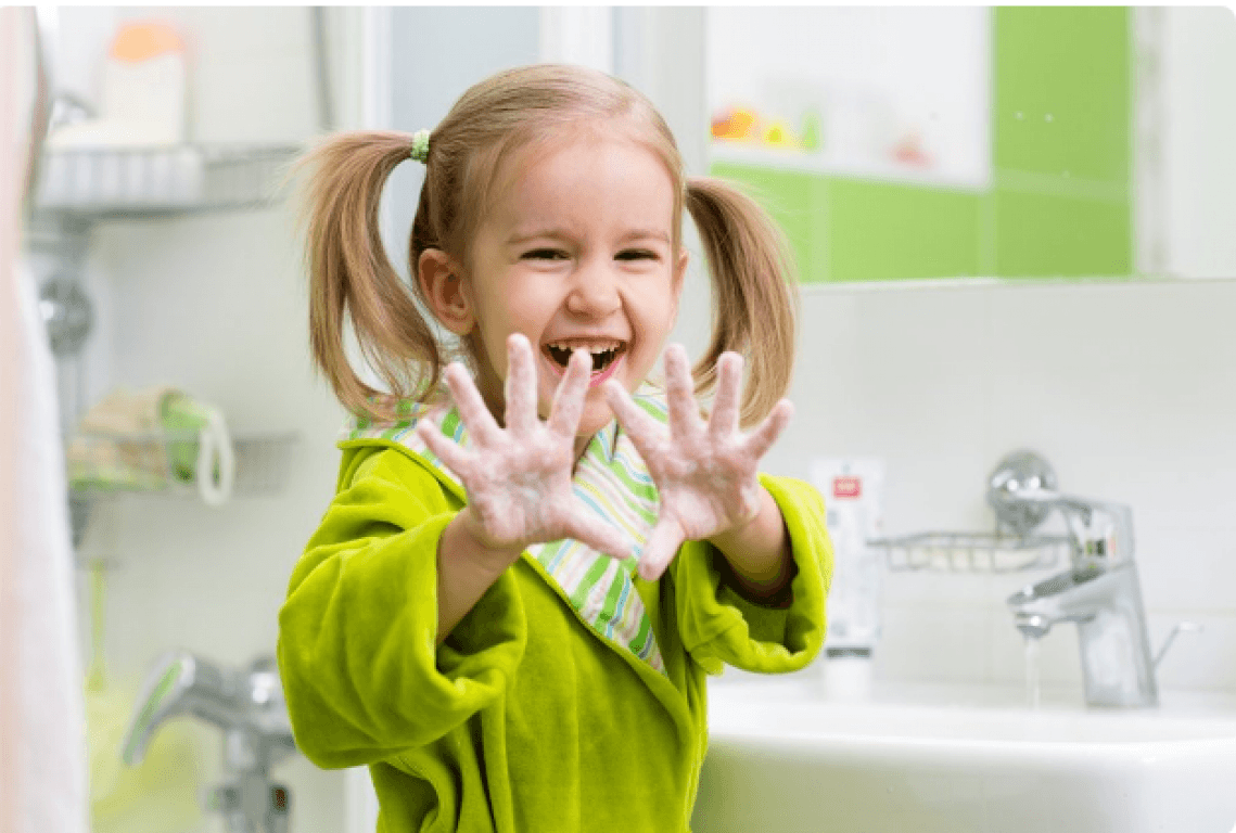 После возвращения домой из детского сада полезно не только хорошо вымыть руки с мылом, но и умыть лицо.