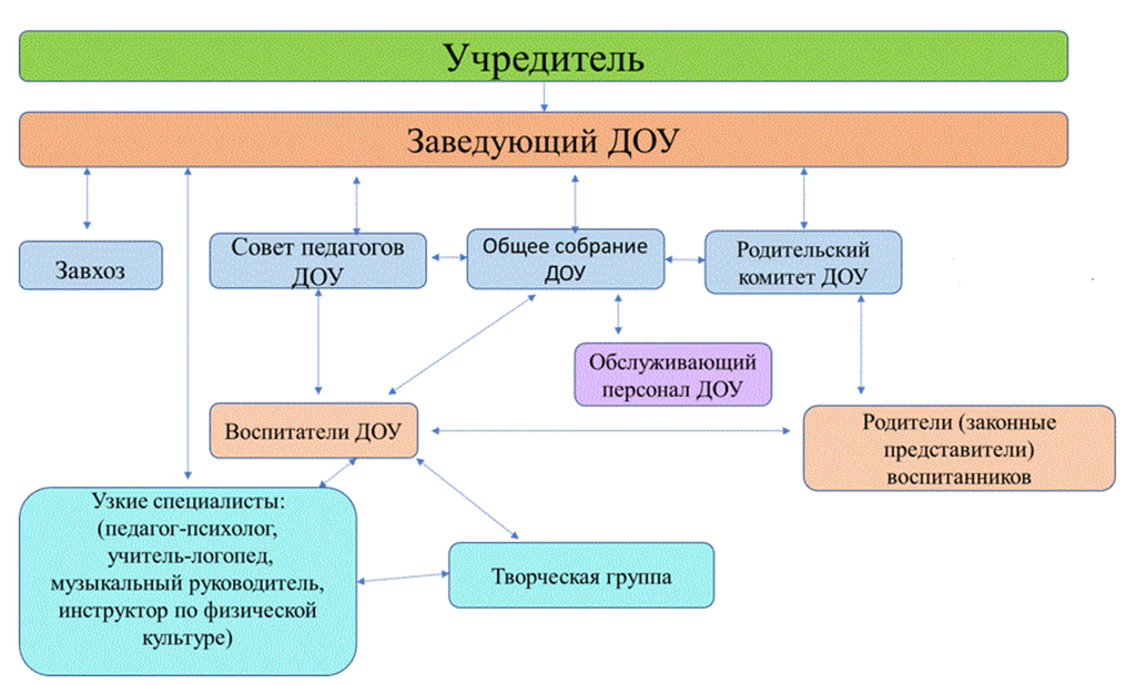 Третий уровень управления осуществляют педагоги ДОУ (воспитатели, музыкальный руководитель, учитель-логопед, инструктор по физической культуре) и обслуживающий персонал. На этом уровне объектами управления являются дети и их родители. На данный момент общая численность штата ДОУ – 24 человека. В детском саду соблюдаются социальные гарантии участников образовательного процесса.